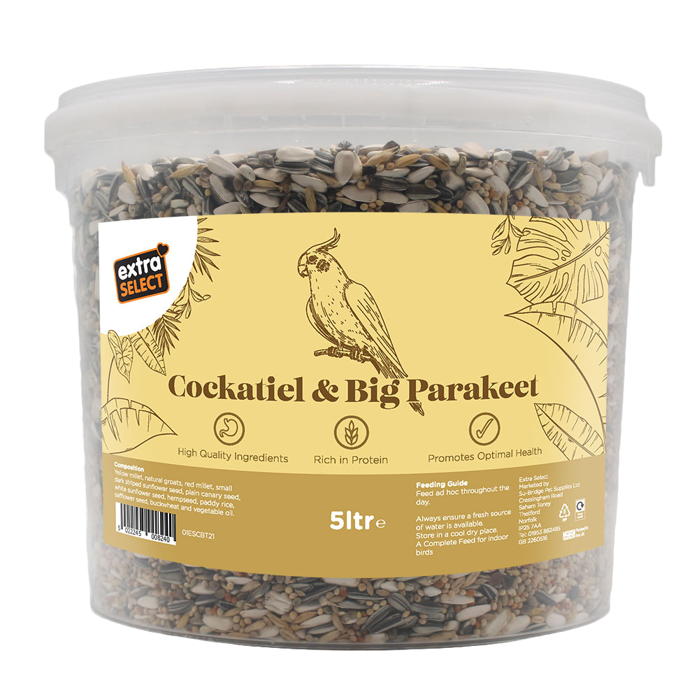 Extra Select Cockatiel & Big Parakeet Mix Bucket is a complete and nutritious feed for cockatiels and larger parakeets. Made with high-quality, protein-rich ingredients, it helps support energy, overall health, and wellbeing.