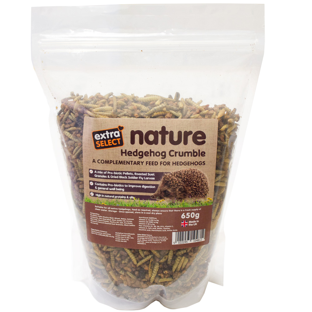 Extra Select Nature Hedgehog Crumble is a complementary feed for hedgehogs, combining probiotic pellets, roasted suet granules, and dried Black Soldier Fly Larvae. Rich in natural proteins and oils, it supports digestion, overall health, and general wellbeing.