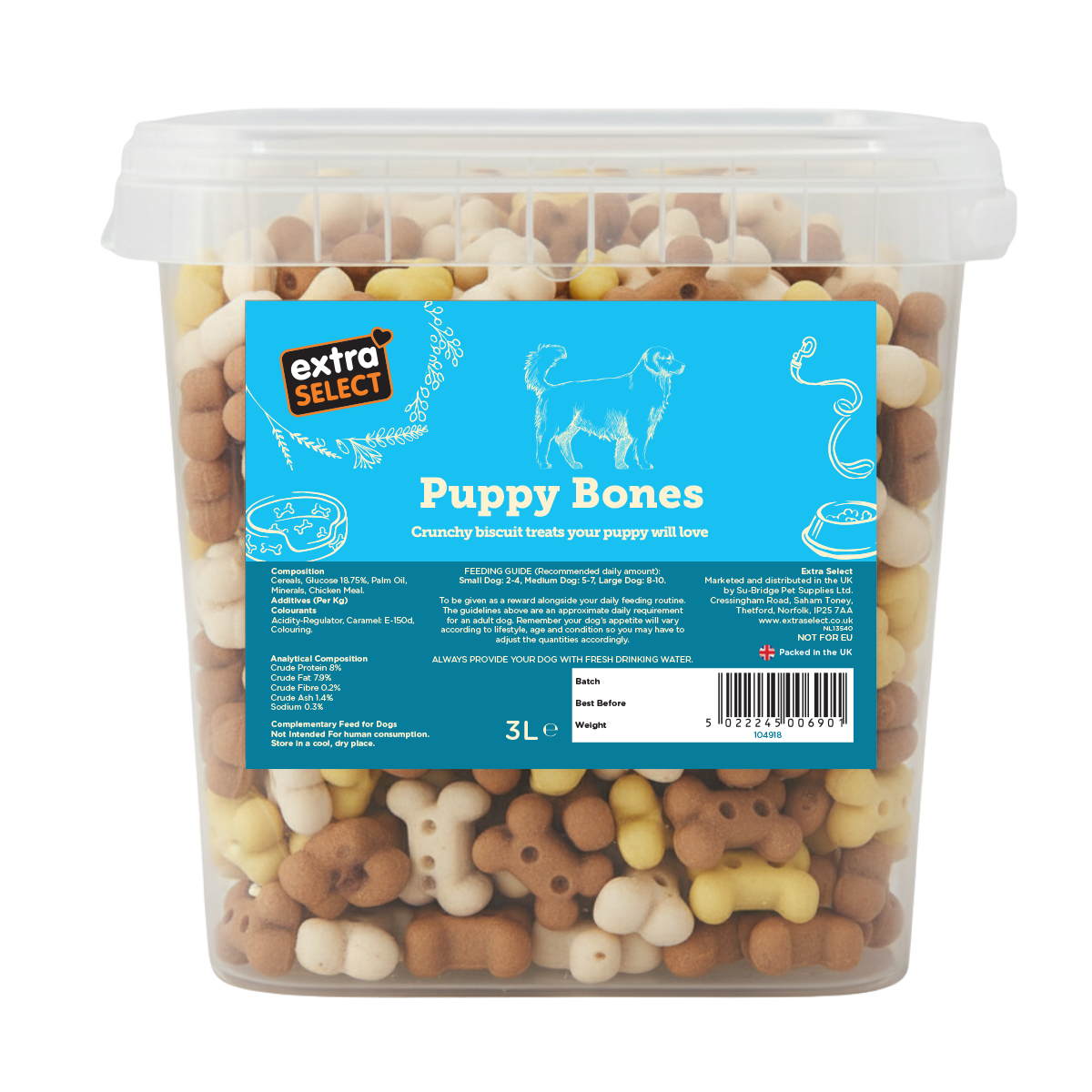 Extra Select Puppy Treat Bones are a delightful selection of vanilla flavoured, bite-sized, bone-shaped snacks made specifically for puppies. Perfect for rewarding good behaviour or training, these treats are gentle on young teeth and easy for little mouths to enjoy.