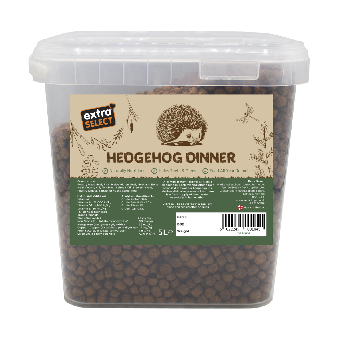 Extra Select Premium Dry Hedgehog Dinner is a naturally nutritious food specially developed to support the health and wellbeing of hedgehogs.