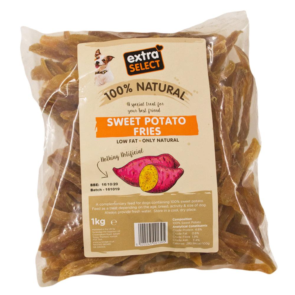 A complementary feed for dogs containing 100% sweet potato. Feed as a treat depending on the age, breed, activity & size of dog. Always provide fresh water. Store in a cool, dry place.
